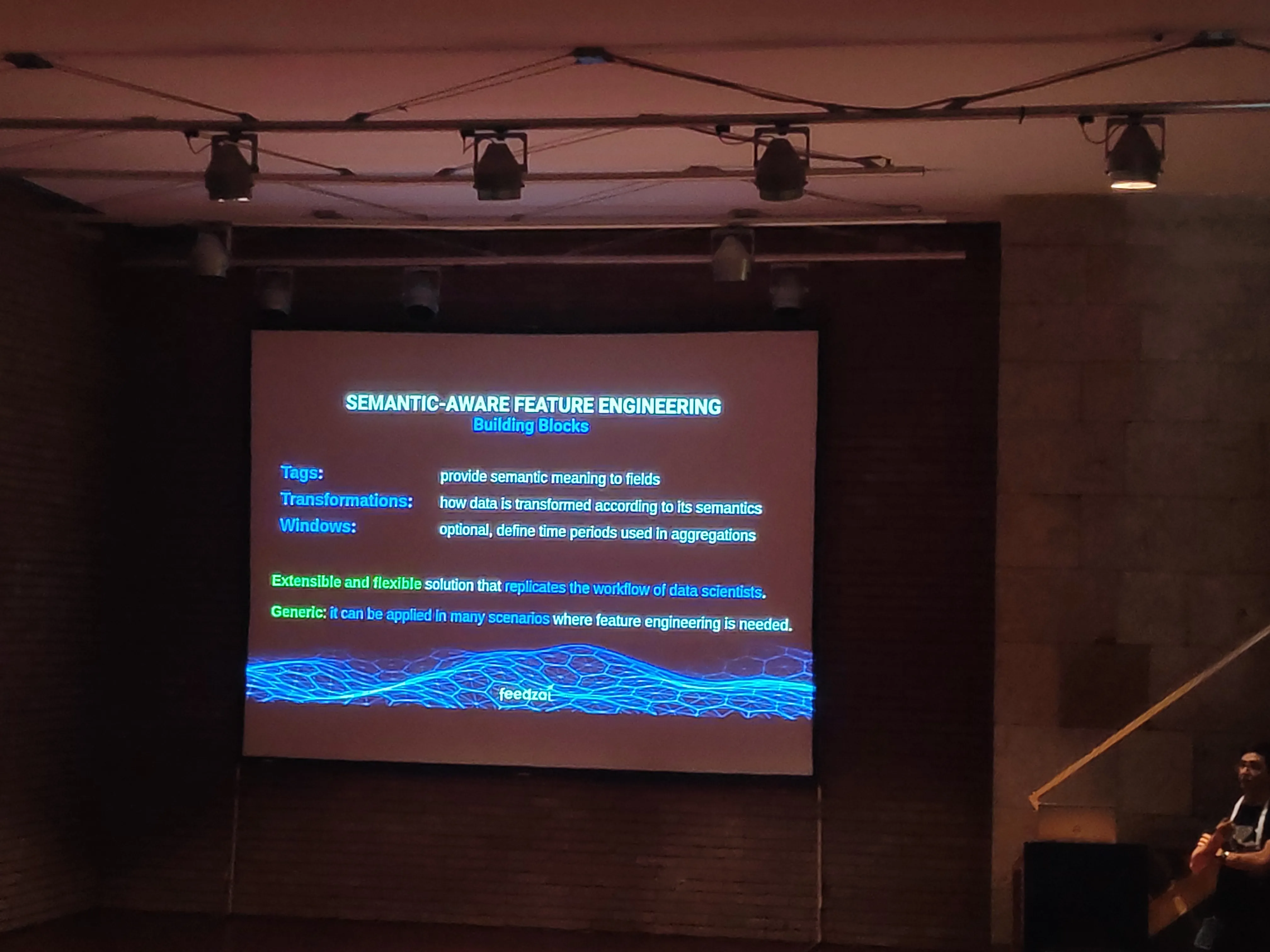 The first one, and what I deemed as the most interesting, focuses on detecting the best possible features automatically by using tags picked up apriori. This is called feature engineering and Miguel showed some numbers alleging that their methods (in the process of patenting) was much faster and worked at least as good as humans.