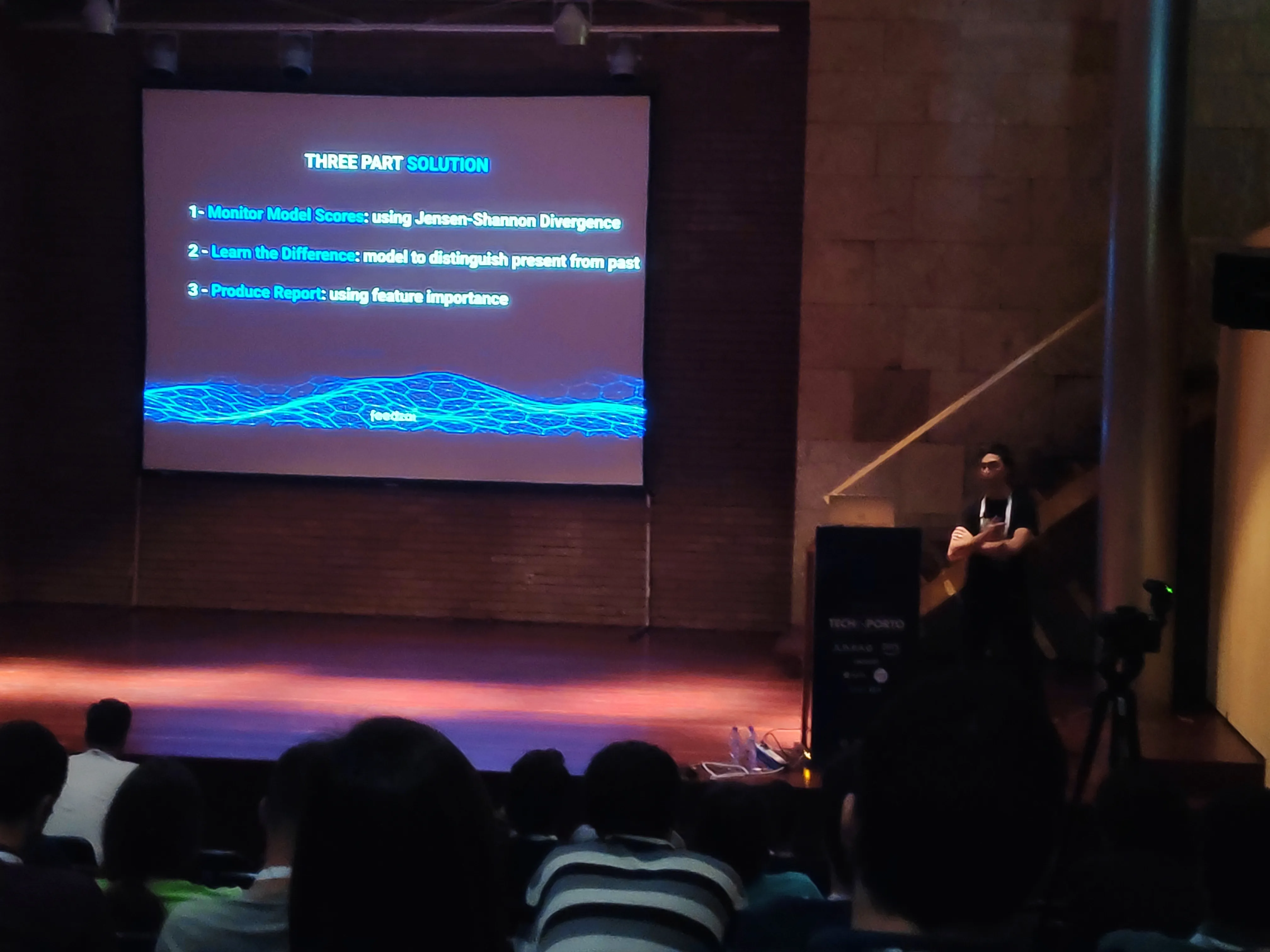 The talk presented by Miguel Araújo, data science manager at Feedzai was an interesting one. He started by explaining the main business, fraud detection, and then went into showing some of the work done to automate data science (autoML) and improve the models in the process.