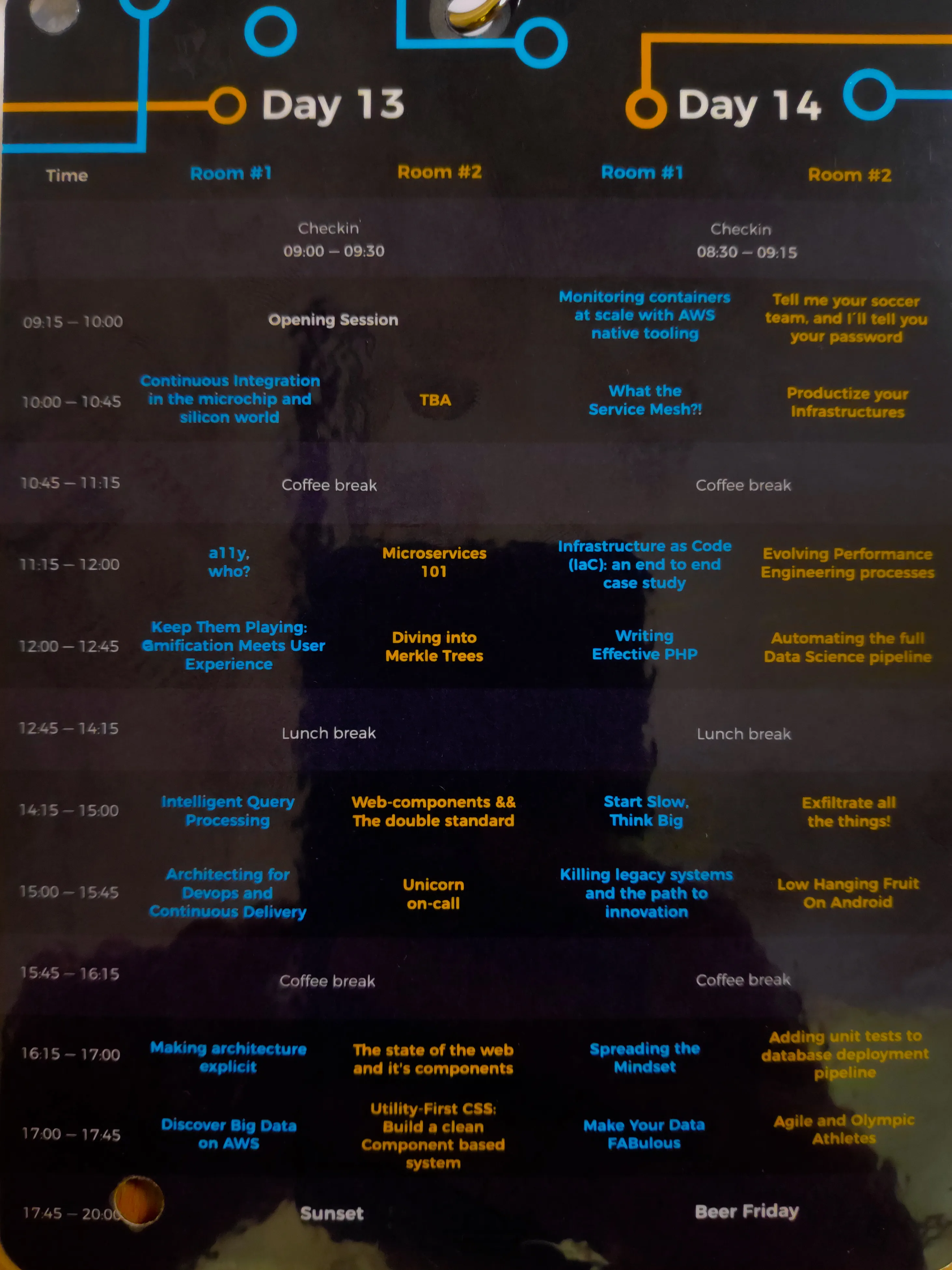 The conference was divided into two rooms and I was lucky enough that there weren’t any talks that I wanted to attend happening simultaneously (kudos for that). Below you can find the entire program