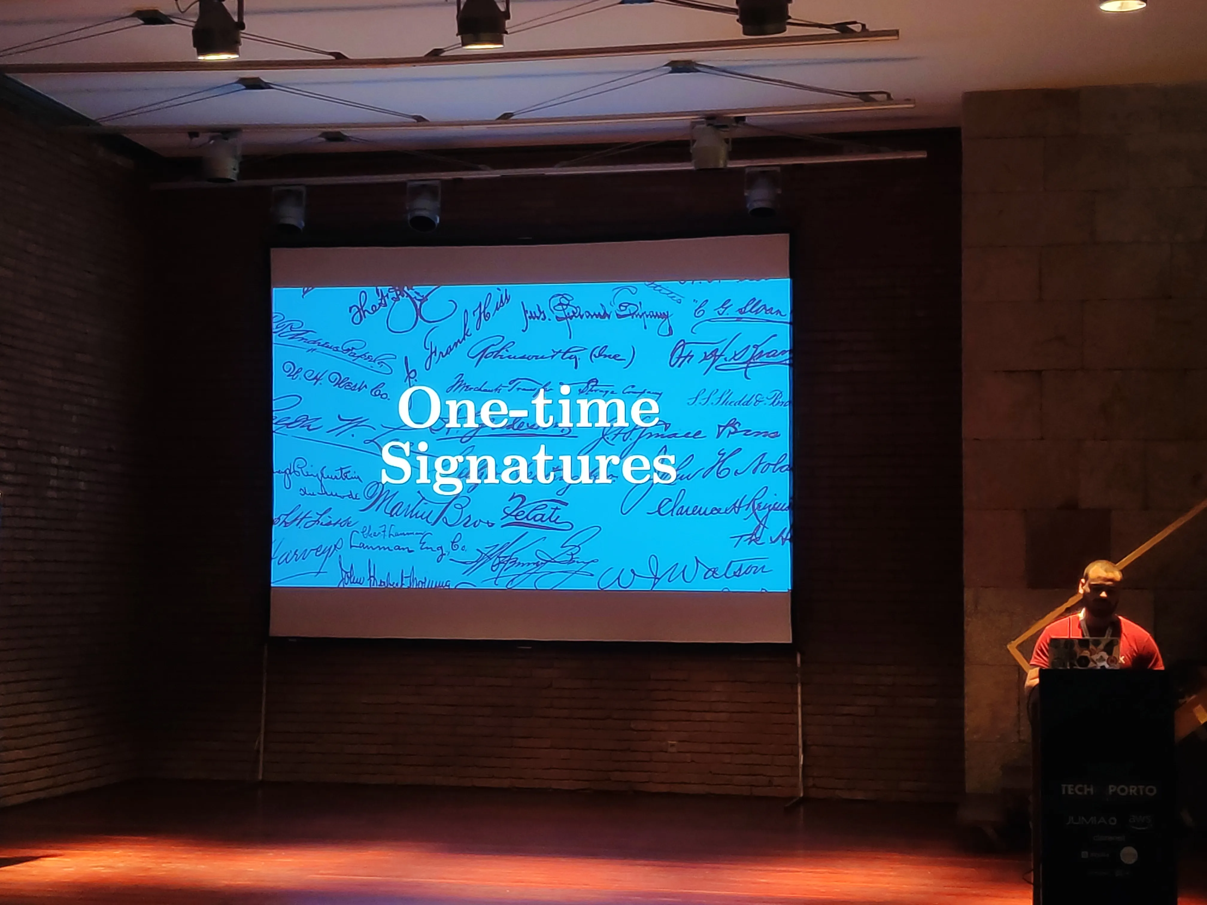 This was one of two talks given by Talkdesk (disclosure: the ompany I work in) and was presented by Pedro Tavares. He starts by presenting a group he’s in, Papers We Love, from where he found a paper called “A certified Digital Signature” from 1989, written by Ralph Merkle.