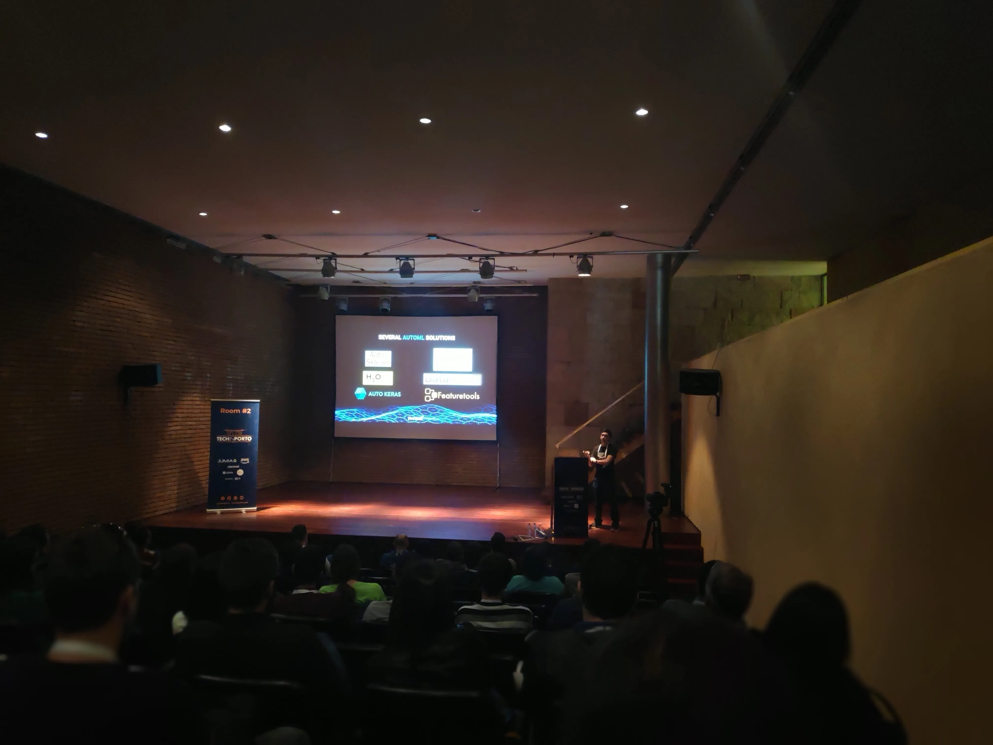 The talk presented by Miguel Araújo, data science manager at Feedzai was an interesting one. He started by explaining the main business, fraud detection, and then went into showing some of the work done to automate data science (autoML) and improve the models in the process.